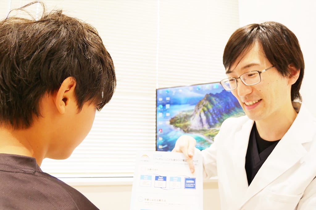 症状によっては、痛くない表面麻酔を使用した後、麻酔も使用して痛みを抑えながら治療をします。